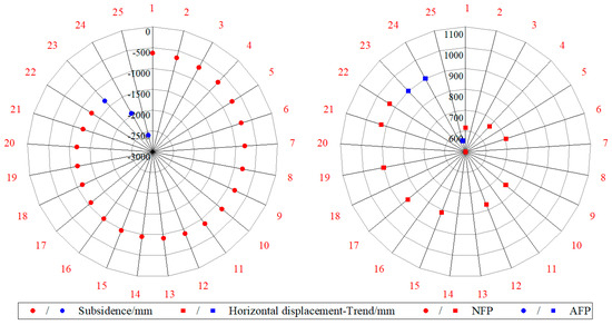 When the mining of the working face is completed, the subsidence and horizontal displacement are calculated using Equations (15) and (16), respectively.