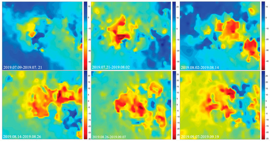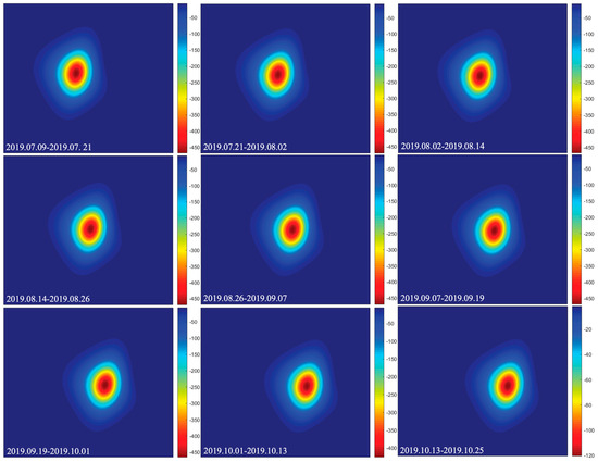 In the data fusion, a differential evolution algorithm was used as a model parameter solver [38]. Based on the correction benchmark established by the fusion (as shown in Figure 8), the corrected LOS deformation during the satellite follow-up period was obtained, as shown in Figure 9. In combination with Figure 6, it can be seen that before and after the correction, the trend of the central area of the mining influence area gradually moved to the southeast and the mining of the working face had not changed. However, after the fusion, the LOS deformation in the center area reached the maximum value under the geological and mining conditions. In addition, the deformation after fusion conformed to the asymmetry phenomenon in the advancing process of the working face, and it retained the difference in the LOS deformation at the edge of the deformed basin.