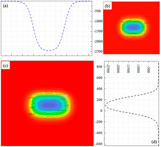 Simulated deformations: (a) LOS deformations along the trend (mm), (b) subsidence (mm), (c) LOS deformations (mm), and (d) LOS deformations along the tendency (mm).