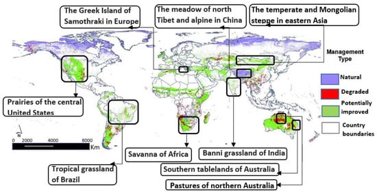 Global distribution of pastures and assessment using remote sensing tools. “Global assessment of land degradation and improvement 1. Identification by remote sensing” (Bai et al., 2008 []). Global grassland classification was embellished to the original map by the authors.