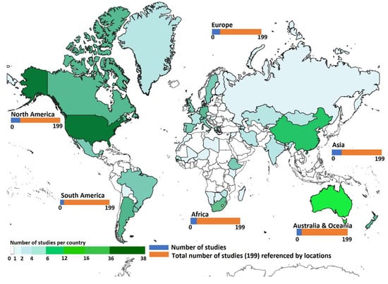 Number of studies from each country and across continents reviewed. Note: the blue and orange colours represent the ratio of the number of studies (blue) compared to the total number of studies (orange).