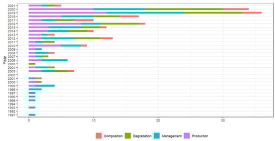 Temporal (annual) pattern of studies reviewed by their topics of coverage. Bars indicate the number of studies published each year.