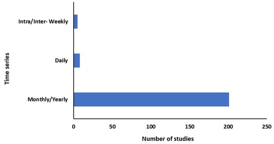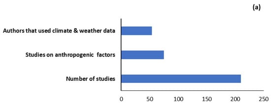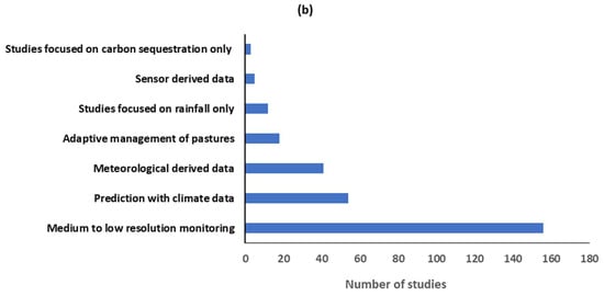 A total of 54 studies (Figure 4a) used climate and weather data to predict climate’s effects on pastures; authors have used climatic data (over at least ten years) and historical time series satellites. Studies focusing on less than ten years were those using a monthly seasonal approach (154 studies) to monitor pastures; we categorised these studies here as “medium to low resolution” (Figure 4b) [,,,,,,,,].