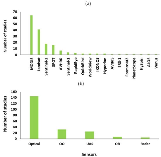 Moderate Resolution Imaging Spectroradiometer (MODIS) (Terra and Aqua) and Landsat instruments were the most used for studies (Figure 6; Table 2 and Table 3). The use of MODIS is enabled by daily revisit, 16-day composite, three spatial and global resolutions (250 m, 500 m, and 1 km), and 36 multispectral bands for wider applications. Long-term data continuity, moderate-resolution imaging, multispectral capabilities, and open data policy (Table 2) are among the factors that have aided Landsat’s utility. In general, the use of sensors by practitioners tends to follow their release, accessibility, and applications (Table 2 and Table 3).