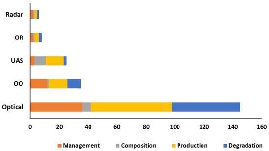 Number of studies ranked by the topics covered: OO = combinational of optical instruments, OR= optical and radar instruments; and UAS = unmanned aerial systems.