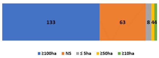Summary of the scale of focus enabled by satellite sensors. Note: NS = “Not specified” for studies that do not provide a definite statement about the scale of coverage in the reviewed studies. Studies (i.e., 63) indicated study locations without providing details about the scale of focus [,,,].