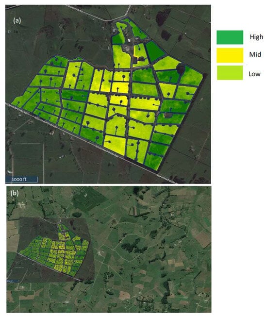 (a) A high PlanetScope imagery quantifying pasture biomass variation at paddock level (image acquired from Planet Lab Inc.; and accessed on 6 April 2021); (b) was georeferenced from (a). Landholders can make management decisions based on pasture availability. (b) was georeferenced using the map features provided (i.e., Ngahinapouri, Waipa District, Waikato, 3882, New Zealand).