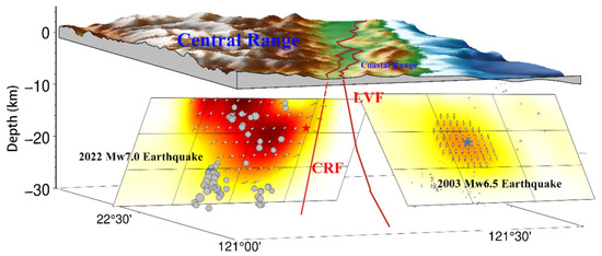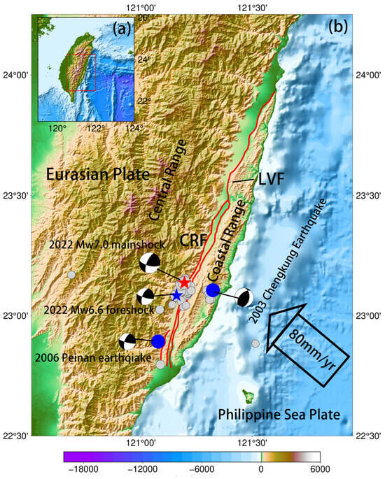 Between 17 September and 18 September 2022, an earthquake sequence starting with an Mw6.6 earthquake occurred in the southeastern portion of the island of Taiwan. This earthquake sequence included nine earthquakes with magnitudes greater than ML5, with the largest main shock being the Mw7.0 earthquake that occurred on 18 September 2022. This earthquake caused severe damage to local buildings and resulted in enormous economic losses [1]. As a stress release process, this earthquake sequence indicates that there is high stress accumulation in the southeastern region of Taiwan. The Taiwan orogen is a critical tectonic position where the Philippine Sea Plate interacts with the Eurasian Plate, that acts as a transition zone for the convergence mechanism of the Philippine Sea Plate relative to the Eurasian Plate [2,3]. The Philippine Sea Plate subducts northward beneath the Eurasian Plate in northeastern Taiwan, while it becomes the Eurasian Plate subducting eastward under the Philippine Sea Plate in southeastern Taiwan [4]. The contact between the two plates in Taiwan and its adjacent sea area has undergone a transformation from subduction–collision–subduction from north to south [5,6]. The collision and compression of the two plates resulted in intense “mountain-building movement”, forming six major geological units from east to west, with “boundary faults” dividing each geological unit. Most of these “boundary faults” are active faults trending north–northeast, which are prone to triggering strong earthquakes. The main active faults include the Lishan-Chaochou fault located in central Taiwan, and the Longitudinal Valley Fault Zone (LVFZ), located in eastern Taiwan [7].