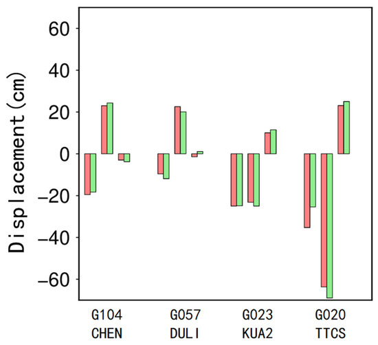 Comparison between static displacements of GPS data and the strong-motion data after baseline correction. Every three pairs of bars in the figure represent a comparison between a very close pair of strong-motion stations and GPS stations. The pink color represents the static displacement of the strong-motion data, and the green color represents the static displacement of the GPS data.