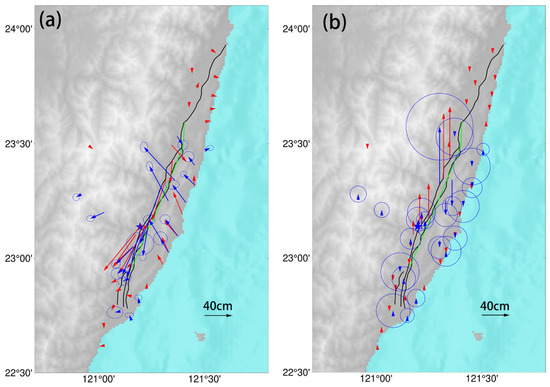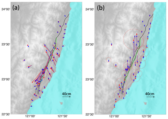 Comparison between observed data and simulated data based on the joint inversion model. (a) The coseismic displacement field in the horizontal direction, and (b) the coseismic displacement field in the vertical direction. The red arrow represents the observed data, and the blue arrow represents the simulated data. The black line represents the Longitudinal Valley Fault zone. The green line represent the fault model used to invert.