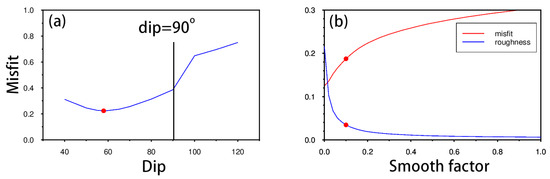 (a) The inclination angle with west-dipping faults represented on the horizontal axis, where 90 represents an inclination angle of 90°, less than 90° represents a west-dipping fault, and greater than 90° represents an east-dipping fault. The vertical axis represents the residual value of the fitting. (b) The smoothing factor on the horizontal axis, where the blue curve represents the roughness and the red curve represents the residual value of the fitting. The red dot represents the optimal location.