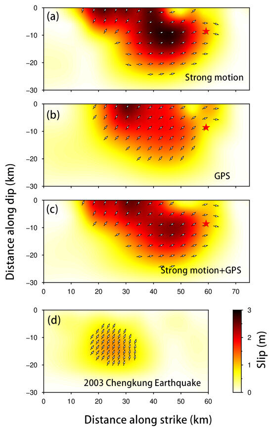 Fault surface slip distribution map. (a) The inversion results using only the strong-motion data, (b) the inversion results using only the GPS data, (c) the inversion results combining both types of data, and (d) the coseismic slip distribution based on inversion of the GPS data for the 2003 Chengkung earthquake. The red pentagon represents the location of the hypocenter. The white arrows represents the direction in which the subfault slip.