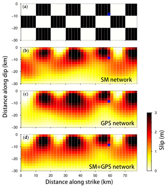 Slip distribution resolution test. (a) The input slip distribution, (b) the inversion results based on the strong-motion network, (c) the inversion results based on the GPS network, and (d) the joint inversion results based on both data types. The blue star represents the hypocenter of earthquake. SM: strong motion; GPS: Global Positioning System.