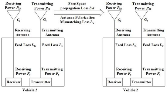 At Level 3, the EMC evaluation focuses on the decrease in receiver sensitivity. The radio wave propagation model of a vehicular radio station depends on the actual communication environment, which includes factors such as terrain, working frequency, communication distance, and antenna characteristics. Hence, analyzing a decrease in receiver sensitivity requires the consideration of radio wave propagation loss, antenna polarization mismatching loss, and feed loss, which is shown in Figure 2.