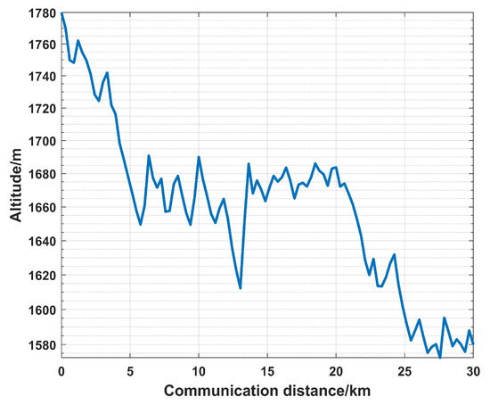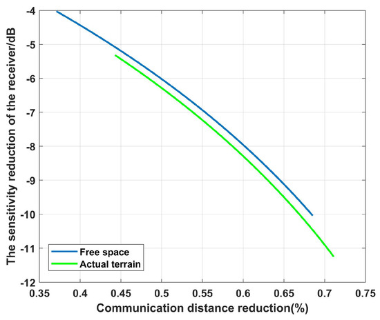 For the provided example, we first computed the communication distance of the armored vehicle in free space and on actual terrain and compared it with the communication distance in the absence of interference to determine the reduction in the communication distance, which are shown in Figure 11.