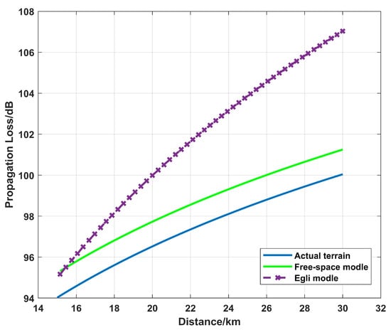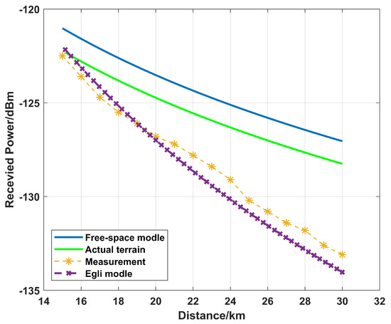 Figure 8 shows that the error between the calculated power received by the receiver in free space and the real measurement is 3.03%. The error of the calculated power received by the receiver in the actual terrain and the real measurement is 2.06%. The error was reduced by 0.97%. When the communication distance is greater than 20 km, there are large errors, and there are even errors when the Egli model is used to calculate the propagation loss and the received power at the receiver. This is because the Egli model is not suitable for communication regions with large terrain fluctuations. Therefore, no comparison with the Egli model is given in Figure 9.