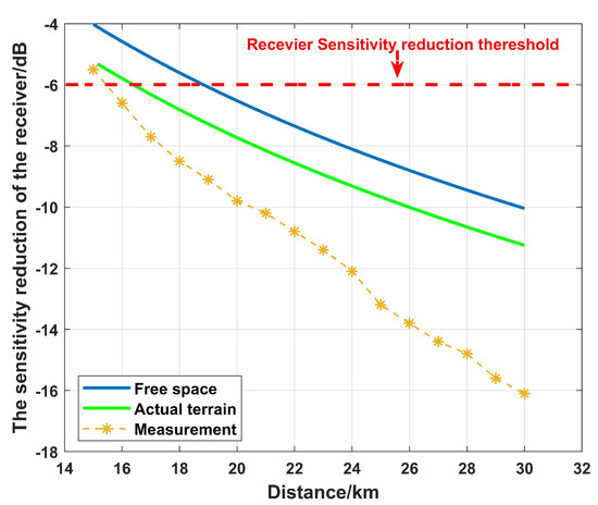 According to the received power of the receiver in free space, on actual terrain, and in the actual measurement data, the sensitivity reduction of the receiver in three cases was calculated using Equation (18), as shown in Figure 9.