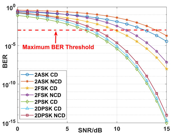 Figure 13 shows the relationship between BER and SNR for seven modulation types: 2PSK coherent modulation, 2DPSK coherent modulation, 2DPSK incoherent modulation, 2FSK coherent modulation, 2FSK incoherent modulation, 2ASK coherent modulation, and 2ASK incoherent modulation. The broken red line in Figure 12 represents the maximum BER threshold for distinguishable audio signals.