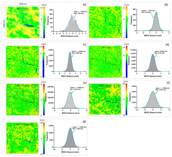 M3C2 distance between the DP model and LS model. (a–g) refer to models DP-3-lowest, DP-3-low, DP-3-medium, DP-3-high, DP-3-ultrahigh, DP-6-ultrahigh, and DP-15-ultrahigh, respectively.