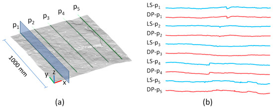 2D Profiles extracted from DP and LS models: (a) positions of the five profiles; (b) profiles of p1–p5.