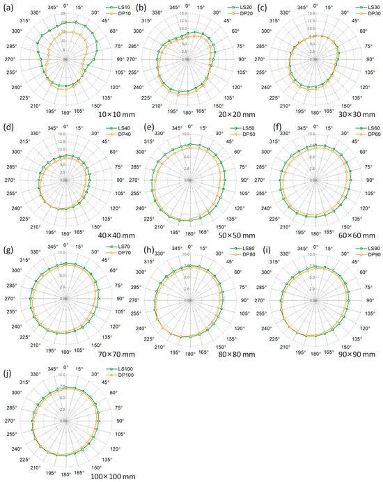 In order to comprehensively evaluate the accuracy and applicability of drone photogrammetry in measuring the 3D roughness of joint surfaces, this study used the central enlargement method to divide the point cloud models into 10 different sizes, ranging from 10 cm × 10 cm to 100 cm × 100 cm, for 3D roughness calculation (as shown in Figure 10). Figure 11 displays the 3D roughness of joint surfaces, varying in size and direction. The green line represents the results of the LS model, and the orange line represents the results of the DP model. When the sample size was 10 cm × 10 cm, there was significant deviation between the DP model and the LS model, with a maximum difference of approximately 5. As the model size increased, the results for the DP model and the LS model became more consistent with each other. Generally, the DP model yielded slightly smaller values compared to those of the LS model. In addition, it can be found that the joint roughness had significant anisotropy (Figure 11a), with a roughness value of 20 in the direction of about 30°, while the roughness value in the direction of 120° was 13. As the model size increased, the anisotropy of the model roughness gradually weakened (as shown in Figure 11b–j).