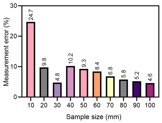 Figure 13 illustrates the measurement errors of 3D roughness for DP models with different sizes. For the joint size of 10 cm × 10 cm, the measurement error was 24.7%. As the joint size exceeded 20 cm × 20 cm, the measurement error decreased sharply and generally did not exceed 10%. When the size of the joint surface was 100 cm × 100 cm, the measurement error reached a minimum of 4.6%. These results are consistent with the measurement errors observed in 2D roughness and affirm that drone photogrammetry is a reliable and practical tool for measuring the roughness of joint surfaces.