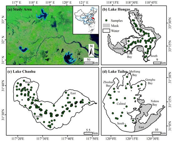 (a) Location of Lake Chaohu, Lake Taihu, and Lake Hongze in China. The spatial distributions of samples in (b) Lake Hongze, (c) Lake Chaohu, and (d) Lake Taihu are shown.