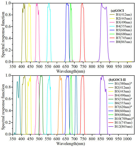 Spectral response functions of (a) GOCI and (b) GOCI-II in different spectral ranges. Note that the bands marked with * are new bands of GOCI-II.