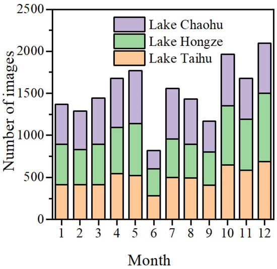 Number of images of Lake Chaohu, Lake Hongze, and Lake Taihu in different months.