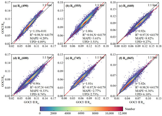 The scatter density plots (Figure 4) for different bands (only six bands were involved in this paper) showed that Rrc of the two sensors exhibited favorable consistency (R2 > 0.94, MAPE < 8.82%, and UPD < 9.27%). According to the linear relationship between the GOCI and GOCI-II Rrc values in different bands, a linear conversion of GOCI-II Rrc values was performed to derive Chla inversion results.