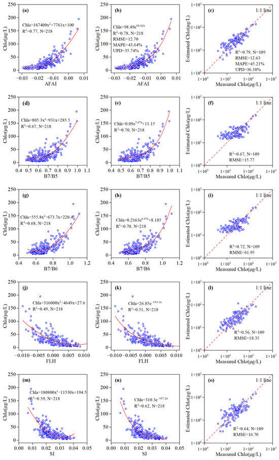 The model equations with high R2 values were quadratic polynomials and exponential equations (Table 3). R2 of the quadratic polynomial equations was lower than that of the exponential equations (Figure 5). In the range of 0–20 μg/L, training of the quadratic polynomial equations did not conform to the monotonous trend in Chla, whereas the trend in the exponential equation results was more realistic. The R2 values of the training and validation data indicated the order of AFAI > B7/B6 > B7/B5 > SI > FLH, and the model was best established by using the AFAI (R2 = 0.79, RMSE = 12.63 μg/L). In summary, for Lake Chaohu, Lake Hongze, and Lake Taihu, the AFAI with an exponential equation (recorded as Chla-AFAI) could better reflect Chla.