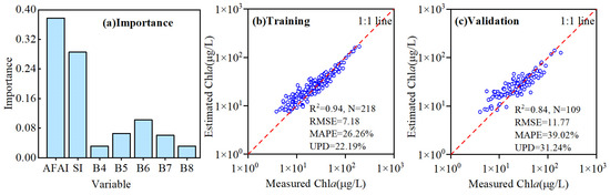 Comparing the Chla-AFAI model (Figure 5b,c) to the Chla-RF model (Figure 6) revealed that the training (R2 = 0.94, RMSE = 7.18 μg/L, MAPE = 26.26%, UPD = 22.19%) and validation results (R2 = 0.84, RMSE = 11.77 μg/L, MAPE = 39.02%, UPD = 31.24%) for Chla-RF were obviously better than those for Chla-AFAI. Therefore, Chla-RF was finally selected as the inversion model for Chla in this paper, which attained better applicability for lakes with complex optical properties.