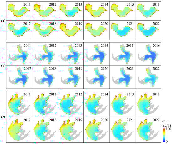 Yearly mean Chla from 2011 to 2022 in (a) Lake Chaohu, (b) Lake Hongze, and (c) Lake Taihu. Note that the GOCI data for 2011 started in May.