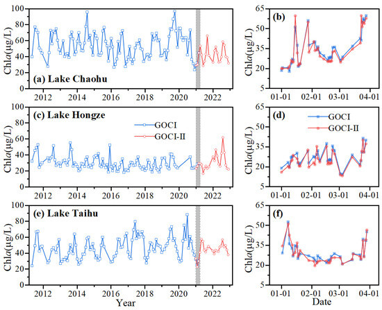 Time series of the monthly mean Chla of GOCI and GOCI-II from 2011 to 2022 in (a) Lake Chaohu, (c) Lake Hongze, and (e) Lake Taihu. Daily mean Chla of GOCI and GOCI-II from January to March 2021 in (b) Lake Chaohu, (d) Lake Hongze, and (f) Lake Taihu.