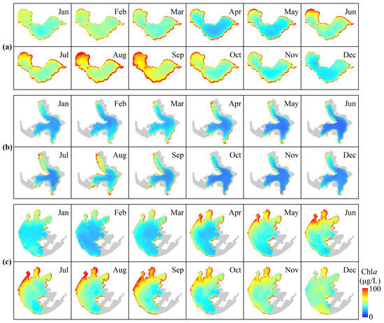 Monthly mean Chla in (a) Lake Chaohu, (b) Lake Hongze, and (c) Lake Taihu.