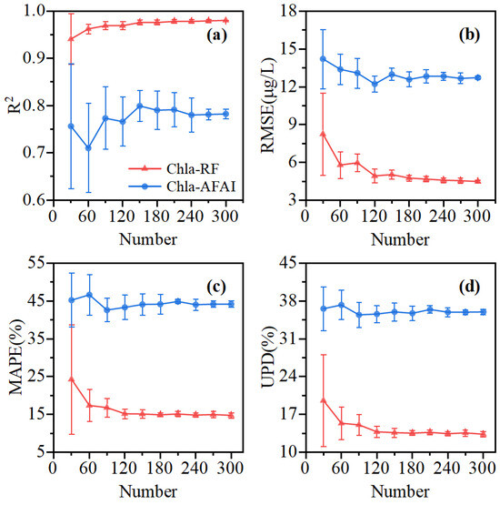 To evaluate the stability of the models, different numbers were selected for validation, and the differences between Chla-RF and Chla-AFAI were compared based on R2, RMSE, MAPE, and UPD (Figure 11). The performance of Chla-RF (R2 > 0.94, RMSE < 8.27 μg/L, MAPE < 24.29%, UPD < 19.60%) was better than that of Chla-AFAI (R2 > 0.71, RMSE < 14.21 μg/L, MAPE < 46.59%, UPD < 37.23%), indicating great advantages in stability and precision. When the sample size was small, the error of both models significantly changed. However, when the number reached 150, the standard deviation decreased, and the models tended to remain stable. In the process of model construction, the accuracy of Chla-RF improved with the increase in sample number after parameter adjustment. However, when the number reached about 240, the increase could only slightly reduce the model error. This is because the sample number is not the only parameter that determines the accuracy of the model; the number of decision trees and max_features considered when constructing the optimal model of the decision tree also have a key influence [6,38]. Therefore, the 218 training and 109 validation samples were relatively reasonable, which not only avoided overfitting problems but also ensured the accuracy of the model and improved its efficiency. Although the inversion principle of an empirical model can be easily defined during model construction, it is not applicable to different regions, and it is sensitive to noise and susceptible to extreme values [39]. Random forest, as a machine learning algorithm, can effectively deal with the complexity of the model, and the nonlinear relationship between variables and Chla can be obtained without prior knowledge [40]. At the same time, the randomness makes the model more accurate and stable, which is also reflected in Figure 11.