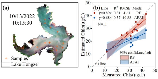 Sampling data of 13 October 2022 (N = 11) for Lake Hongze and GOCI-II Rrc data of the corresponding time (interval time < 1 h) were used to verify and compare the accuracy of the models. The results (Figure 12) proved that Chla-RF (R2 = 0.81, RMSE = 4.61 μg/L) performed better than Chla-AFAI (R2 = 0.37, RMSE = 10.88 μg/L), and the estimated Chla of Chla-RF was closer to the measured Chla than that of Chla-AFAI. We not only effectively evaluated the accuracy of Chla-RF but also verified the consistency of GOCI-II Rrc, providing a guarantee for the continuous use of GOCI series data in Chla inversion.