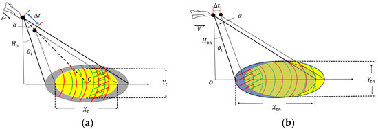 When we observe a sea surface through a stationary radar, the Doppler shift and spectrum bandwidth of sea echoes are mainly caused by the sea surface movement. However, for a radar installed on the moving platform, the Doppler shift and spectrum bandwidth would also be affected by the movement of the platform. The dive staring motion (Figure 1a) and the horizontal motion (Figure 1b) are two common motion states of radar platforms. As shown in Figure 1a, for the dive staring motion platform, the radar footprint on the sea surface and the resolution unit contained in the footprint both change with the movement of the platform. In Figure 1a, the grey area represents the footprint at time , the yellow area denotes the footprint after a time lag . If the value of is large, the echoes from sea surface acquired at time and would be completely uncorrelated with each other [37]. In this work, time lag is set as the radar pulse repetition period. With the movement of the platform, in Figure 1a, we can see that the radar footprint gradually becomes smaller, and the resolution unit becomes mismatched (the shadow areas are represented by the red and green curves). In order to quantitatively describe the change in radar footprint with the movement of the platform, the relationship between the size of the footprint and the velocity of the platform is given below. In Figure 1a, the shape of the footprint can be approximated as an ellipse. The center of the ellipse is labeled by C. Assume that the initial altitude of the platform is and the flight speed of the platform is . Then, the slant range from the dive motion radar platform to the center point C at the time can be expressed as:
