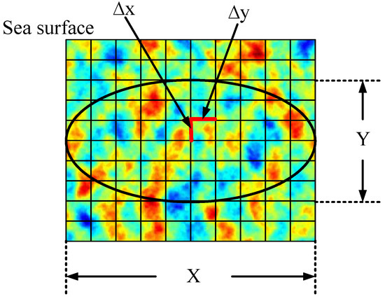 The sea surface in the area of the radar footprint is simulated by the linear filtering method [38]. According to linear theory, the sea surface can be described as the sum of a large number of harmonics with different amplitudes, frequencies, and random phases. When using the linear filtering method for sea surface simulation, the sampling intervals and depend on the dimensions of the simulated sea surface (if the dimensions of the sea surface are and , we set and ). Therefore, in the actual simulation, a large-scale, two-dimensional sea surface is simulated first to avoid the frequency leakage effect. Then, according to the size of the footprints calculated by Equations (2), (3), (5) and (6), an ellipse is approximated in the center of the simulated sea surface as the actual irradiation area of the radar. It should be noted that, according to the sub-scattering surface facet method, the spatial scales of the surface facet, i.e., and , are much less than the range resolution of the radar. In this work, we set . Here, denotes the range resolution of the radar, is the lightspeed in vacuum, and is the bandwidth of the radar. After the sea surface simulation, as shown in Figure 2, the sea surface in the footprint is intercepted according to the actual footprint area.