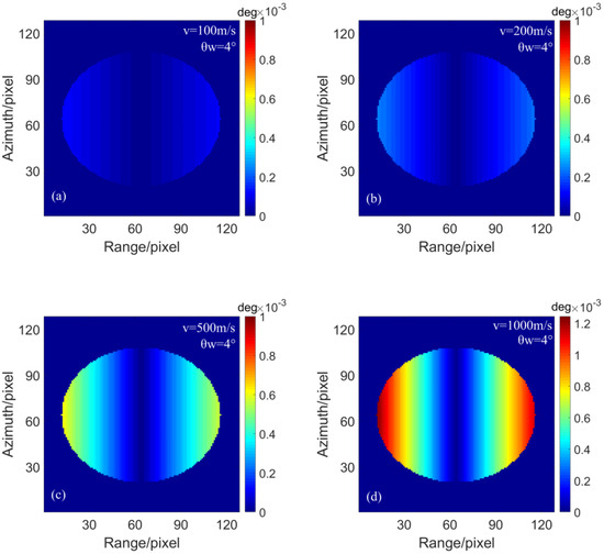 where , , is the wavenumber of the incident electromagnetic wave. The subscripts ‘’ and ‘’ denote ‘H (Horizontal)’ or ‘V (Vertical)’ polarizations. is the incidence angle, denotes the variation in the incidence angle. The values of in the footprint for different radar platform speeds are shown in Figure 3. Here, the central incidence angle of the radar beam is , the radar beam width is 4°, and the initial height is set to 3 km. The pulse repetition rate is 400 Hz (i.e., the time lag ). As shown in Figure 3, the value of increases with platform speed. The values of also increase with the distance from the gaze center along the range direction. Although the change in incident angle is still very small when the speed of the platform reaches 1000 m/s, its effect on the correlation coefficient cannot be neglected if the size of the range resolution and the value of the wavenumber are both large. For example, a Ku-band radar platform flying at 500 m/s has a range resolution of 50 m, in which case the correlation coefficient of the non-staring center can be reduced to 0.87.