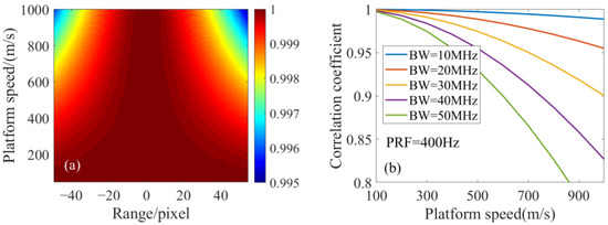 where is the mismatch error along the distance direction of the range resolution units before and after a pulse repetition period. Figure 4 shows the change in correlation coefficient induced by the mismatch error for the dive staring radar platform and the horizontal motion radar platform. The radar pulse repetition rate is set as 400 Hz and the incident angle is 30°. It can be seen that the influence of the mismatch error on the correlation coefficient increases with the increase in platform speed. Moreover, for the dive staring radar platform, the further away the platform is from the gaze center, the more significant the influence of the mismatch error on the correlation coefficient. From Figure 4b, we can also see that the values of the correlation coefficient induced by the mismatch decrease with the radar bandwidth (radar resolution).