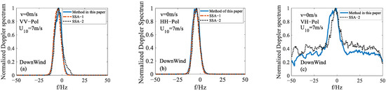 The SSA proposed by Voronovich [28] has been proved to be an effective approximate analytical method for evaluating the electromagnetic scattering of the sea surface [48,49]. To verify the validity of the method proposed by us in this work, the calculation results of our method were compared with those calculated by SSA-1 and SSA-2. Detailed parameter settings are shown in Table 1. Radar frequency and environmental parameters were common, while other parameters are empirically set. The radar platform has a horizontal motion; the platform speeds were 0 m/s (stationary state), 50 m/s and 200 m/s respectively. For comparison, the normalized Doppler spectrum calculated by SSA-1 and our method are given in Figure 5. The result is an average of 80 samples. When the platform velocity is 50 m/s and 200 m/s, the display result is the result of spectrum aliasing, because the Doppler display range is limited by the pulse repetition frequency. Maximum unambiguous Doppler frequency is consequently 50 Hz. The comparison shows that the results simulated by our method are in good agreement with the results of SSA in both co-polarization and cross-polarization.