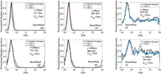 The normalized Doppler spectrum calculated by SSA and our method with different polarizations in the L-band acquired on a horizontal motion radar platform: (a–c) 0 m/s, (d–f) 50 m/s, (g–i) 200 m/s.
