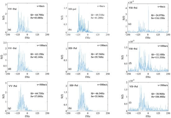 The influence of platform speeds on Doppler spectrum characteristics of the scattering fields acquired by a dive staring motion radar with different polarizations: (a–c) 0 m/s, (d–f) 100 m/s, (g–i) 500 m/s.