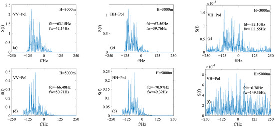 The Doppler characteristics of sea surface echo at different initial heights: (a–c) 3000 m, (d–f) 5000 m.