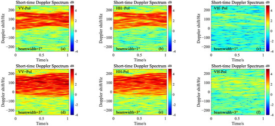 The influence of beam width on short-time Doppler spectrum characteristics at different polarizations: (a–c) the beam width is 1°, (d–f) the beam width is 3°.