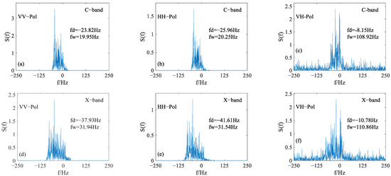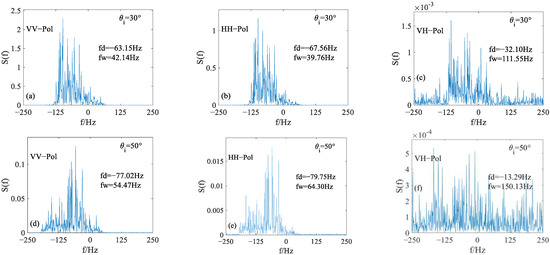 The Doppler characteristics of sea echoes at different incident angles: (a–c) 30°, (d–f) 50°.