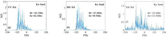 The Doppler characteristics of sea surface echo at different radar frequencies: (a–c) C-band, (d–f) X-band, (g–i) Ku-band.