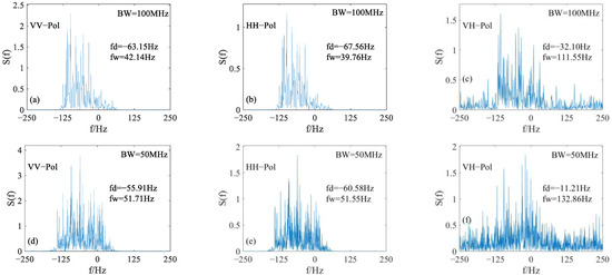 The Doppler characteristics of sea surface echo at different bandwidths: (a–c) 100 MHz, (d–f) 50 MHz.