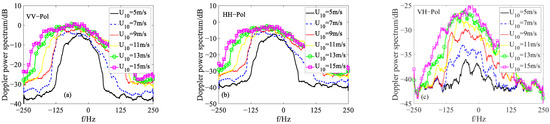 The Doppler power spectrum at different wind speeds ranging from 5 m/s to 15 m/s: (a) VV-Pol, (b) HH-Pol, (c) VH-Pol.